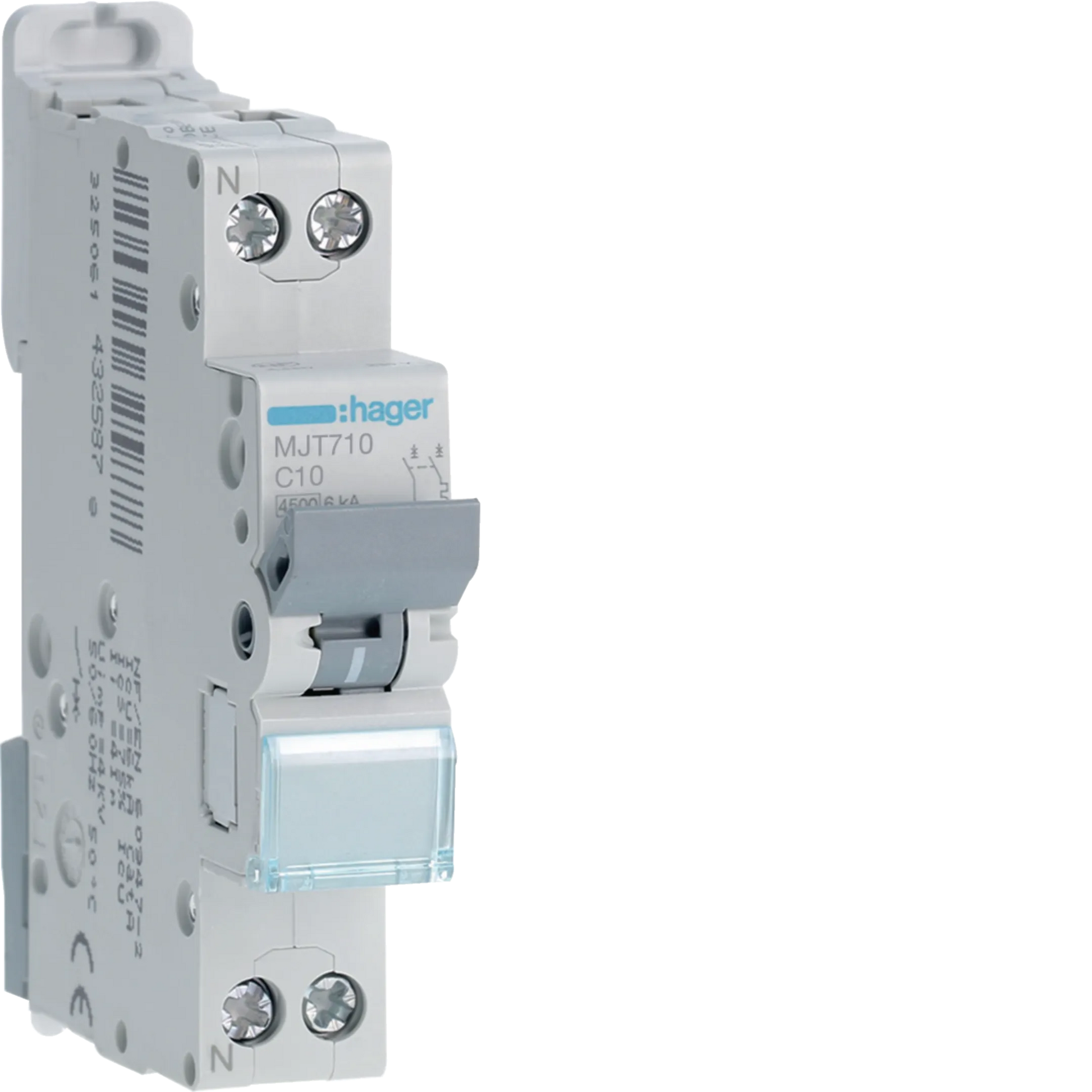 Le disjoncteur Hager MJT710 d'une capacité de 10 ampères est conçu pour protéger les circuits électriques contre les surcharges et courts-circuits. Sa capacité de coupure de 4.5 à 6kA et sa courbe C permettent une déconnexion rapide en cas de surintensités modérées, idéal pour les installations tertiaires. Grâce à ses bornes décalées sur 1module, il est compact, et permet d'optimiser l'espace utilisé dans le tableau électrique.