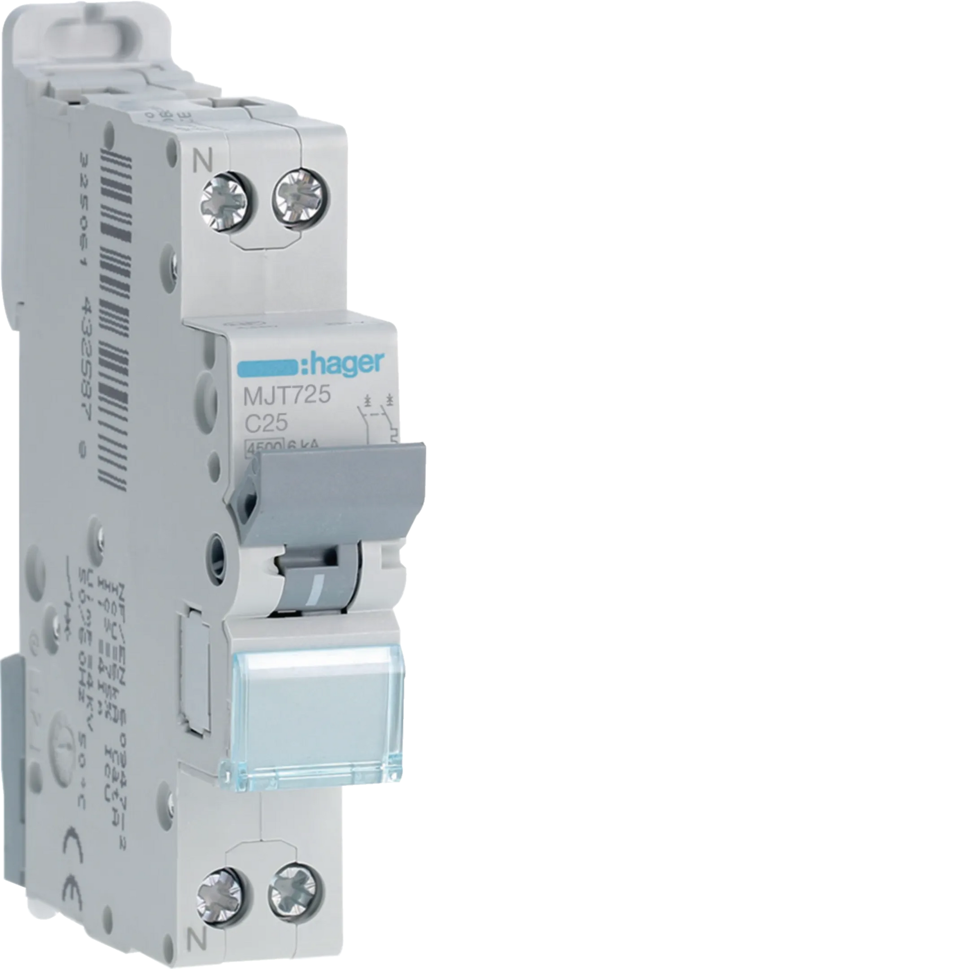 Le disjoncteur Hager MJT725 d'une capacité de 25 ampères est conçu pour protéger les circuits électriques contre les surcharges et courts-circuits. Sa capacité de coupure de 4.5 à 6kA et sa courbe C permettent une déconnexion rapide en cas de surintensités modérées, idéal pour les installations tertiaires. Grâce à ses bornes décalées sur 1module, il est compact, et permet d'optimiser l'espace utilisé dans le tableau électrique.