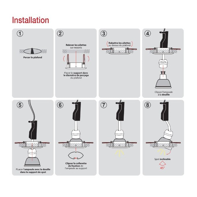 Ce support rond est orientable à la finition aluminium argente. La fixation de ce sot au plafond se réalise par les ailettes sur ressorts prévues à cet effet. Concernant l'ampoule qui peut être de culot GU10 ou 5.3 au choix, sa fixation se fait par cerclage à clipser. Ce support n'est pas étanche et n'est pas utilisable en volume 1 des salles de bain. Ce support est vendu sans ampoule ni douille